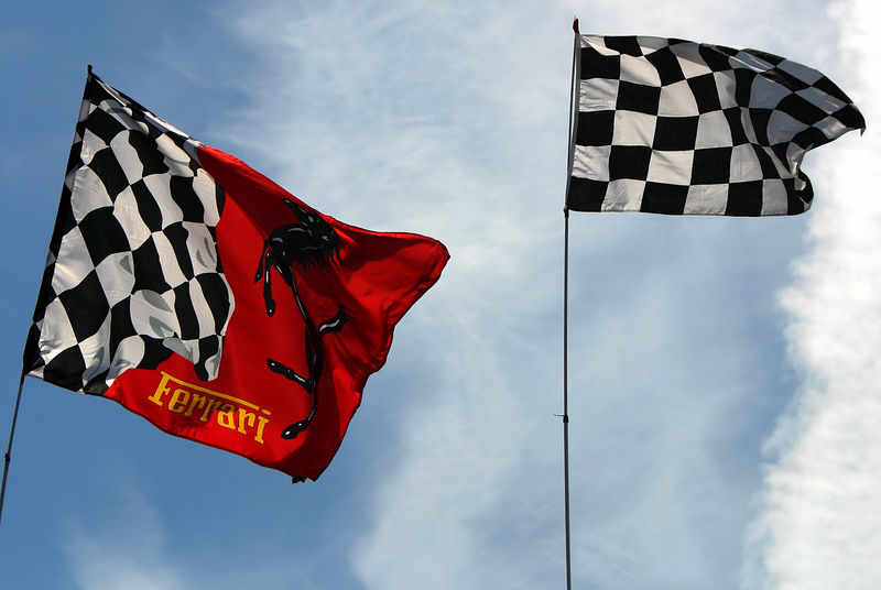 Flags were prevalent all over the circuit. Here, the checkered flag sits appropriately next to the winning team flag for Ferrari.