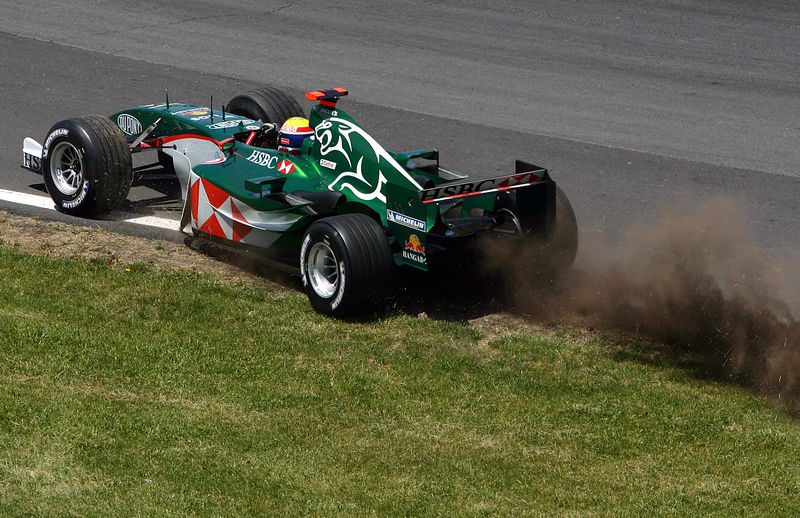 The Jaguar of Mark Webber, as he recovers from being pushed off track at the first turn.