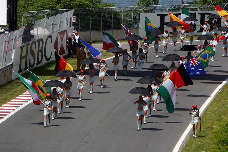 The parade features the pit-babes as they move up the first straight in position on the starting grid.