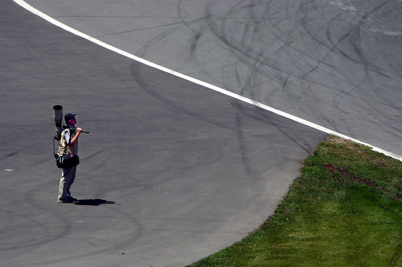 One of many photographers at the race, standing in the infield between races, looking tired from carrying his 600mm lens around.