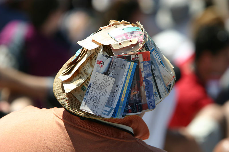 Clearly a veteran race-goer, wearing all his previous ticket stubs on his hat.