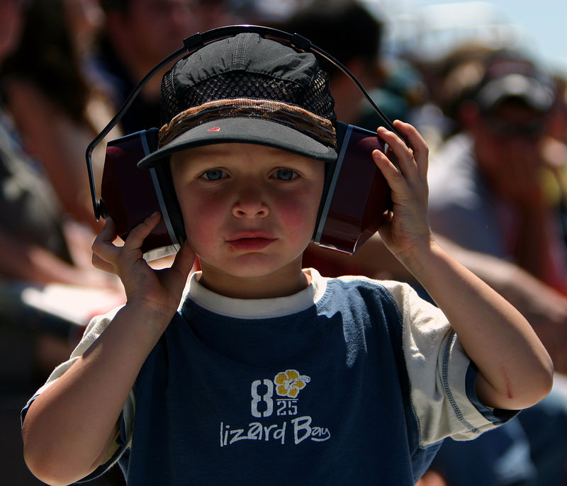 A young fan, well outfitted for the loud din that the Formula One cars produce.